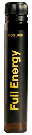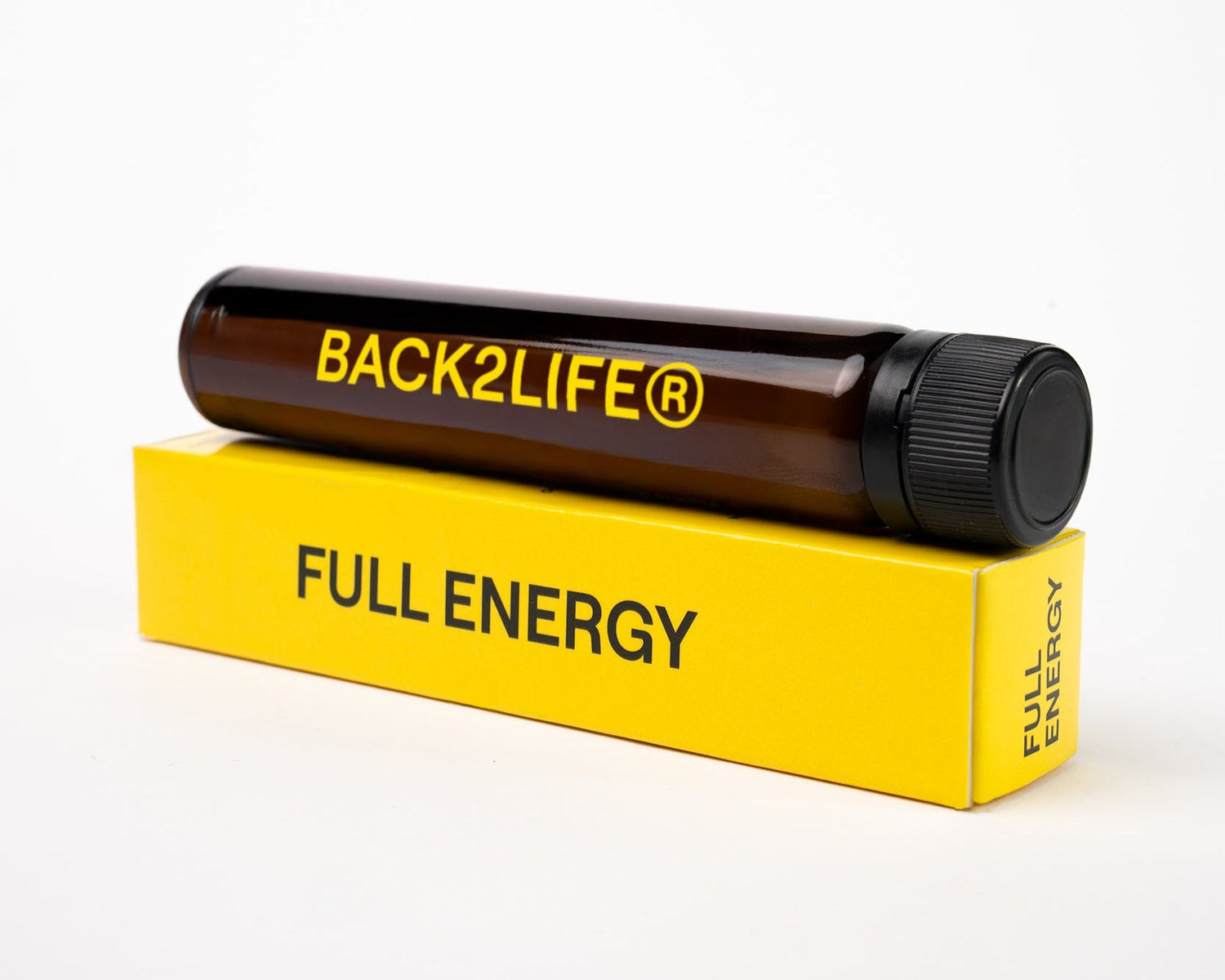 Full Energy de Back2Life es un shot bebible de 25 ml, 100% natural, formulado con 17 ingredientes activos como guaraná, magnesio, vitaminas del grupo B, adaptógenos y aminoácidos.